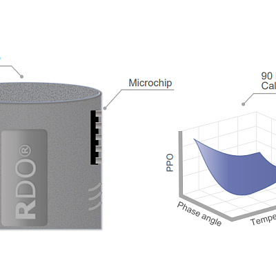 - DO концентрация получается из измерения времени жизни люминесценции на основе сдвига фазы между красным отраженный свет от возбужденного люмифора молекулы и красный контрольный свет от красный светодиод.