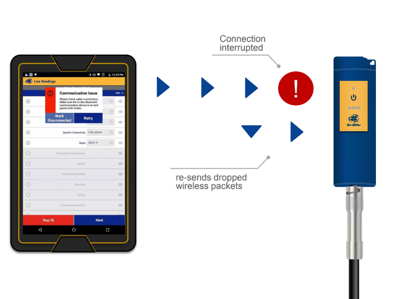 Система обнаруживает и повторно посылает отброшенные беспроводные пакеты. Если устройство находится вне диапазона, выходя на связь повторно VuSitu возобновляет текущую передачу.