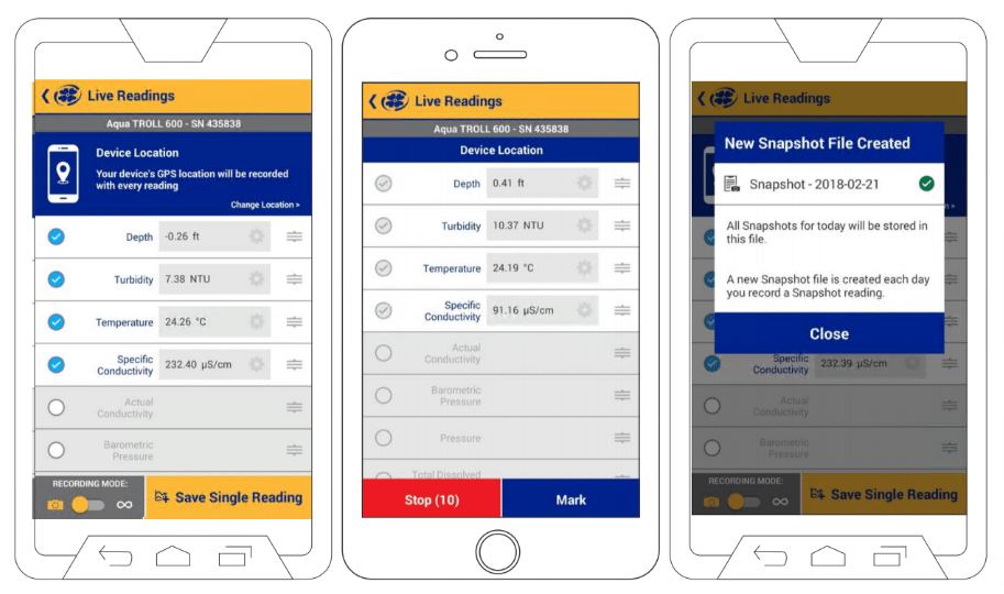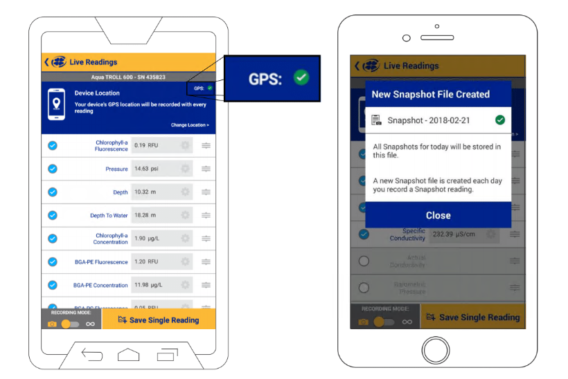 VuSitu предоставляет режим «Снимок», который позволяет пользователям быстро получать отдельные показания и сохранять их в файле ежедневного журнала.