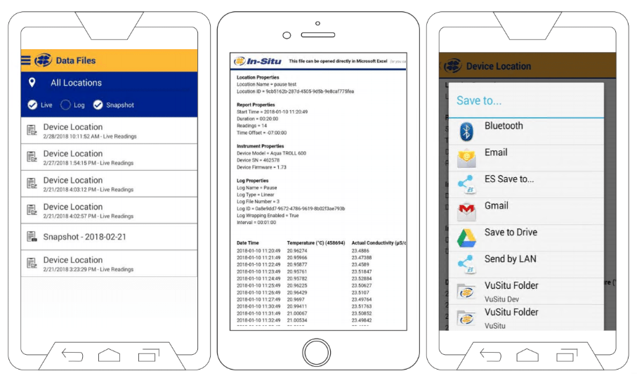 Мобильное приложение VuSitu подключается к инструментам In-situ® Inc. для сбора данных о качестве и количестве воды. Просмотр, хранение и отправка данных по электронной почте с вашего телефона